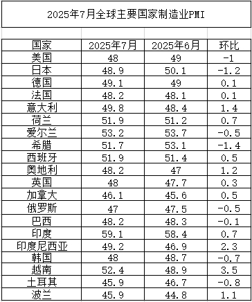 2025年7月全球主要国家和地区制造业PMI